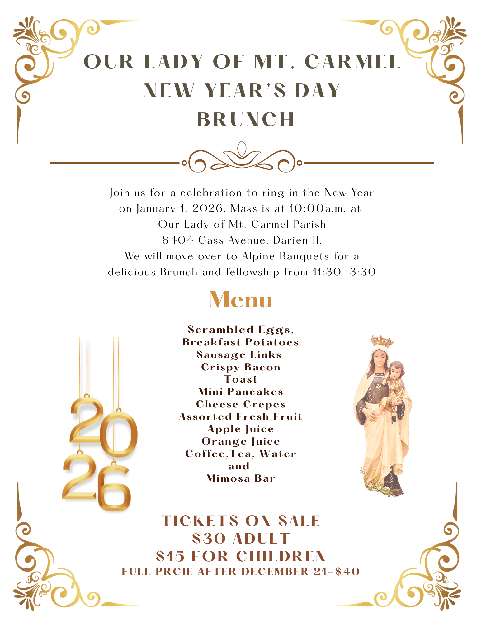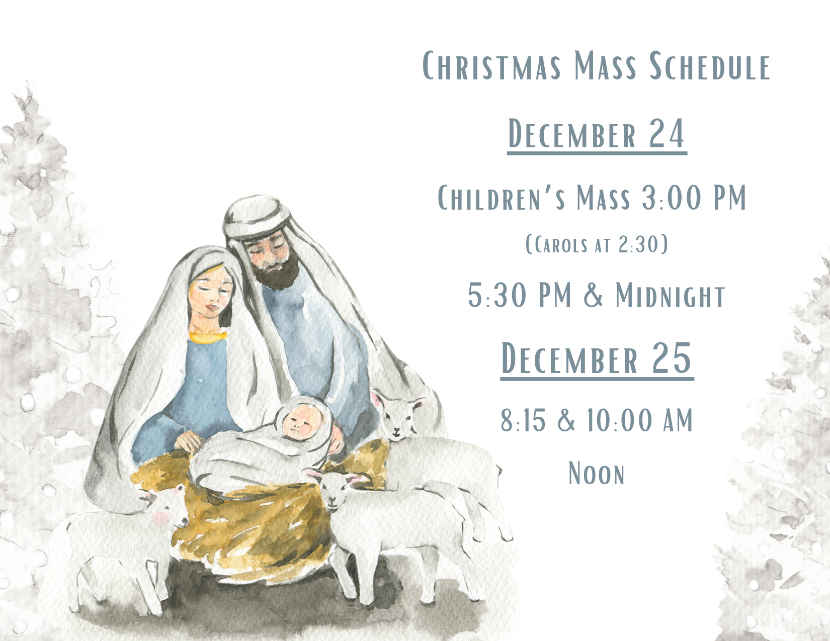 Our Lady of Mount Carmel in Darien invites you and your family to join us at one of our Christmas Celebrations. Every Mass will start with carols about 15 minutes before.